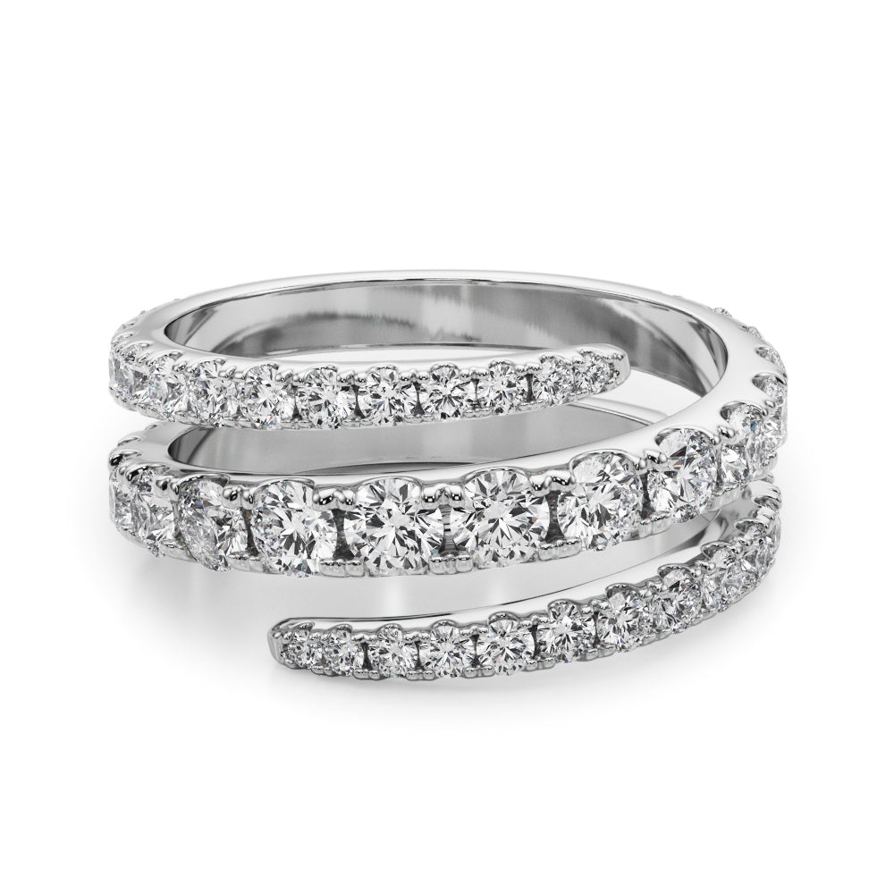 Make a modern statement with the Celestial Diamond Spiral Ring. This architectural piece creates the illusion of three stacked bands in one fluid motion. The ring coils elegantly around the finger, featuring rows of prong-set round diamonds that sparkle from every angle. The open bypass design offers a contemporary edge, making this the ultimate cocktail ring for the fashion-forward woman.